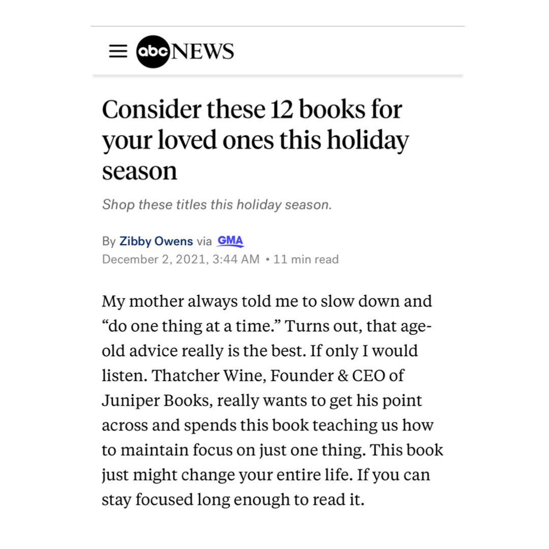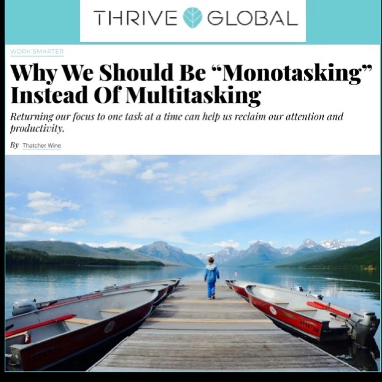 GMA3 What You Need To Know Monotasking 101. TV Segment Podcasts The Ed Mylett Show Achieve More Bliss By Monotasking. Podcast The Art of Manliness Podcast. Become a Focused Monotasker. Podcast All Things Risk Podcast. Thatcher Wine on Monotasking. Podcast mindbodygreen Habits That Can Secretly Upgrade Your Health. Article & Podcast A Mindful Moment with Teresa McKee Mindfulness and Monotasking. Podcast Experience This! Masterplans, Motorcycles, and Monotasking! Podcast Success Made to Last Podcast Rick and Thatcher talk monotasking and more! Podcast My Wake Up Call with Dr. Mark Goulston Books, entrepreneurship, and monotasking. Podcast Best Life Best Death Living your best life through monotasking. Podcast Online goop What Happens When You Stop Multitasking. goop Thrive Global Why We Should Be “Monotasking”" Instead of Multitasking. thriveglobal.com Forbes Master The Art Of Monotasking: Train Your Brain To Resist Distractions. Forbes Article Shondaland Forget Multitasking — Here’s Why You Should Try Monotasking Instead shondaland article Entrepreneur Magazine Is Monotasking the New Multitasking? Entrepreneur Article Pollen, the SimplePractice.com Blog Monotasking: How We Reclaim Our Attention Article The Upside Monotasking: The Power of Doing One Thing at a Time to Feel Better ALL the Time vitacost.com Television abc News Consider these 12 books for your loved ones this holiday season. Zibby’s Book Recommendations